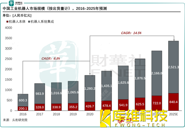 工業(yè)機(jī)器人是我國(guó)智能制造2025的核心抓手之一,是我國(guó)機(jī)器換人、制造業(yè)產(chǎn)業(yè)升級(jí)的核心環(huán)節(jié)。目前看,我國(guó)制造業(yè)三化仍處于初級(jí)階段,我國(guó)工業(yè)機(jī)器人中長(zhǎng)期看仍具有較大的增長(zhǎng)空間。據(jù)頭豹研究院預(yù)測(cè),到2025年,中國(guó)工業(yè)機(jī)器人行業(yè)市場(chǎng)規(guī)模將達(dá)到3361.7億元,未來(lái)五年的年復(fù)合增長(zhǎng)率約為14.5%。