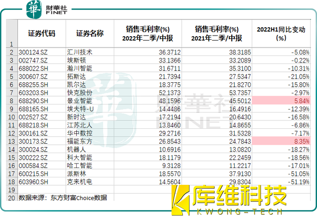 而由于原材料成本上漲,今年上半年各主要工業(yè)機(jī)器人廠商的毛利率普遍同比下降,只有兩家企業(yè)的毛利率同比上升。