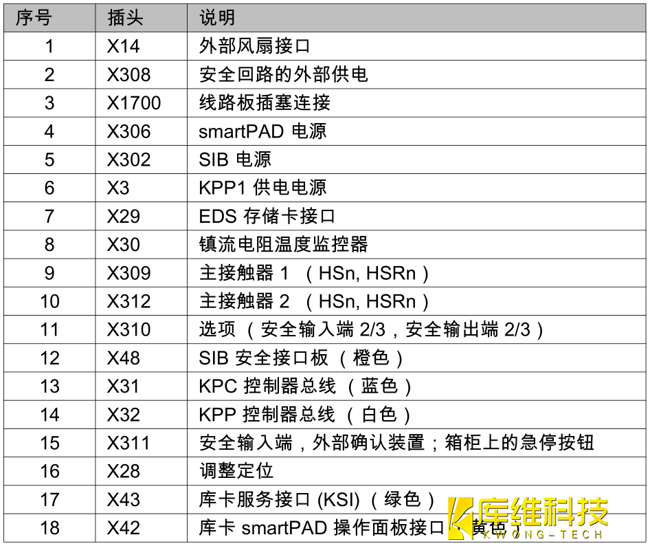 控制柜 (CCU)包含兩塊電路板 (CIB 控制柜接口板和 PMB 電源管理板),是機器人控制系統所有組件的配電裝置和通訊接口. 所有數據通過內部通訊傳輸給控制系統,并在那里繼續處理. 當電源斷電時,