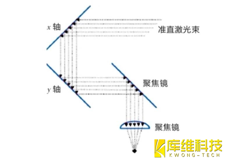 振鏡焊接頭的主要組成部分為擴束準(zhǔn)直鏡、聚焦透鏡、XY 兩軸掃描振鏡、控制板卡以及上位機計算機軟件系統(tǒng)。振鏡可以改變激光光束的方向,通過電磁驅(qū)動機構(gòu)帶動擺動或通過步進電機驅(qū)動旋轉(zhuǎn)掃描。通過振鏡的運動,可以實現(xiàn)對光束的快速掃描,控制光斑在焊縫上高速移動,獲得理想的焊縫。光束從QBH進入準(zhǔn)直模塊,轉(zhuǎn)變?yōu)槠叫泄馐俳?jīng)過聚焦模塊進行聚焦,以糾正激光束在聚焦平面上的枕形畸變,保證光束在同一焦平面內(nèi)的精準(zhǔn)移動。目前,實現(xiàn)光束擺動主要通過能夠承受高功率激光的振鏡實現(xiàn),如圖所示。